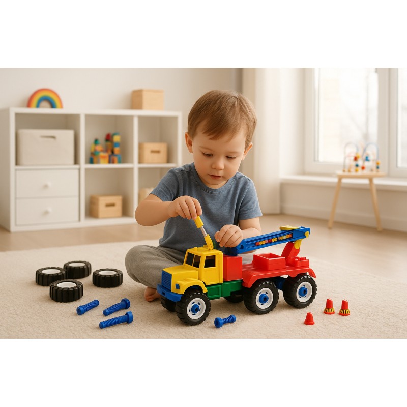 Samochód - dźwig to idealna propozycja dla małych pasjonatów pojazdów budowlanych, oraz mechaników. Samodzielna naprawa, to największa frajda z zabawy :) Dodatkowym atutem jest możliwość zdemontowania i złożenia pojazdu z części składowych, co nie tylko sprawia ogromną frajdę, ale rozwija umiejętności malualne i logicznego myślenia już od 3-go roku życia! |