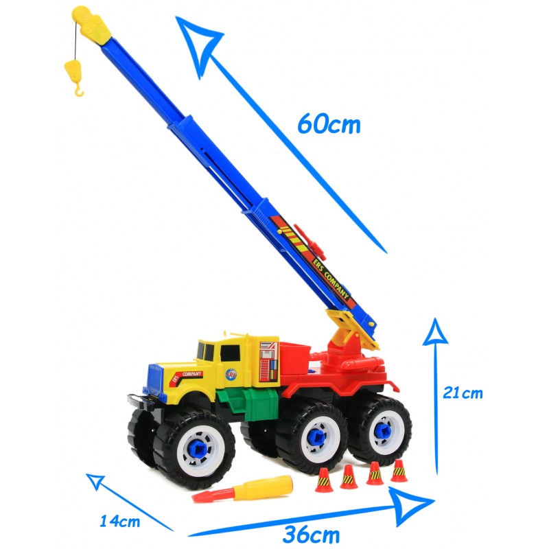 Długość: 36 cm Szerokość: 14,5 cm Wysokość: 21,5 cm Długość drabiny: 55cm Maksymalna długość ramienia po rozciągnięciu: 53 cm Ilość elementów w zestawie: 7 śrub, 1 śrubokręt, 4 pachołki + elementy konstrukcyjne pojazdu Wiek 3+ PRODUKT POLSKI |